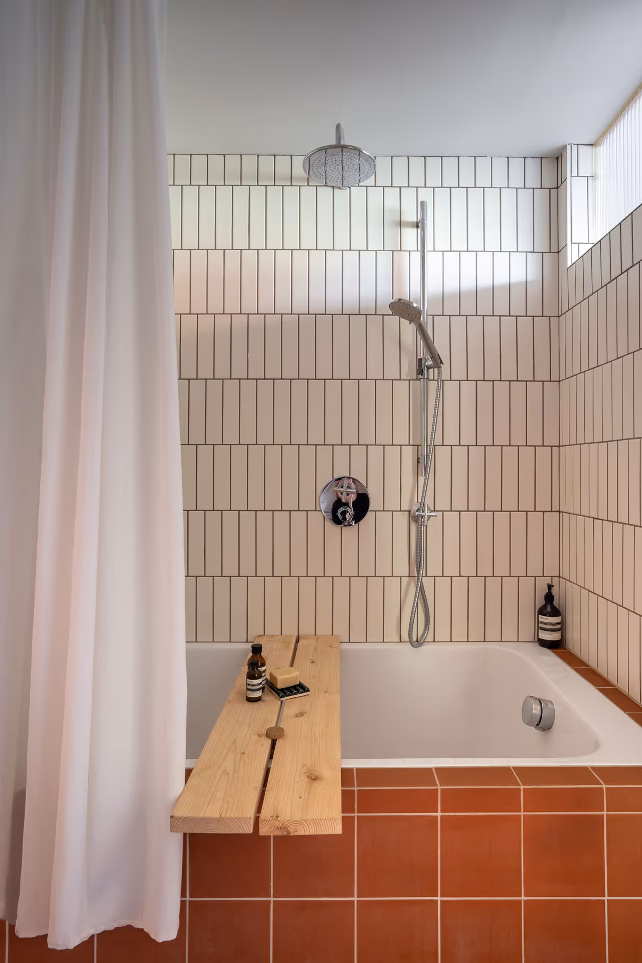 Le rez-de-chaussée a été restructuré pour optimiser les espaces de vie, notamment en descendant la salle de bain à cet étage. Cette dernière a été entièrement repensée pour allier esthétisme et confort : un bain podium, idéal pour l’enfant, une fenêtre intérieure apportant une touche de lumière, et un revêtement en céramique terracotta, créant une continuité visuelle avec la cuisine.