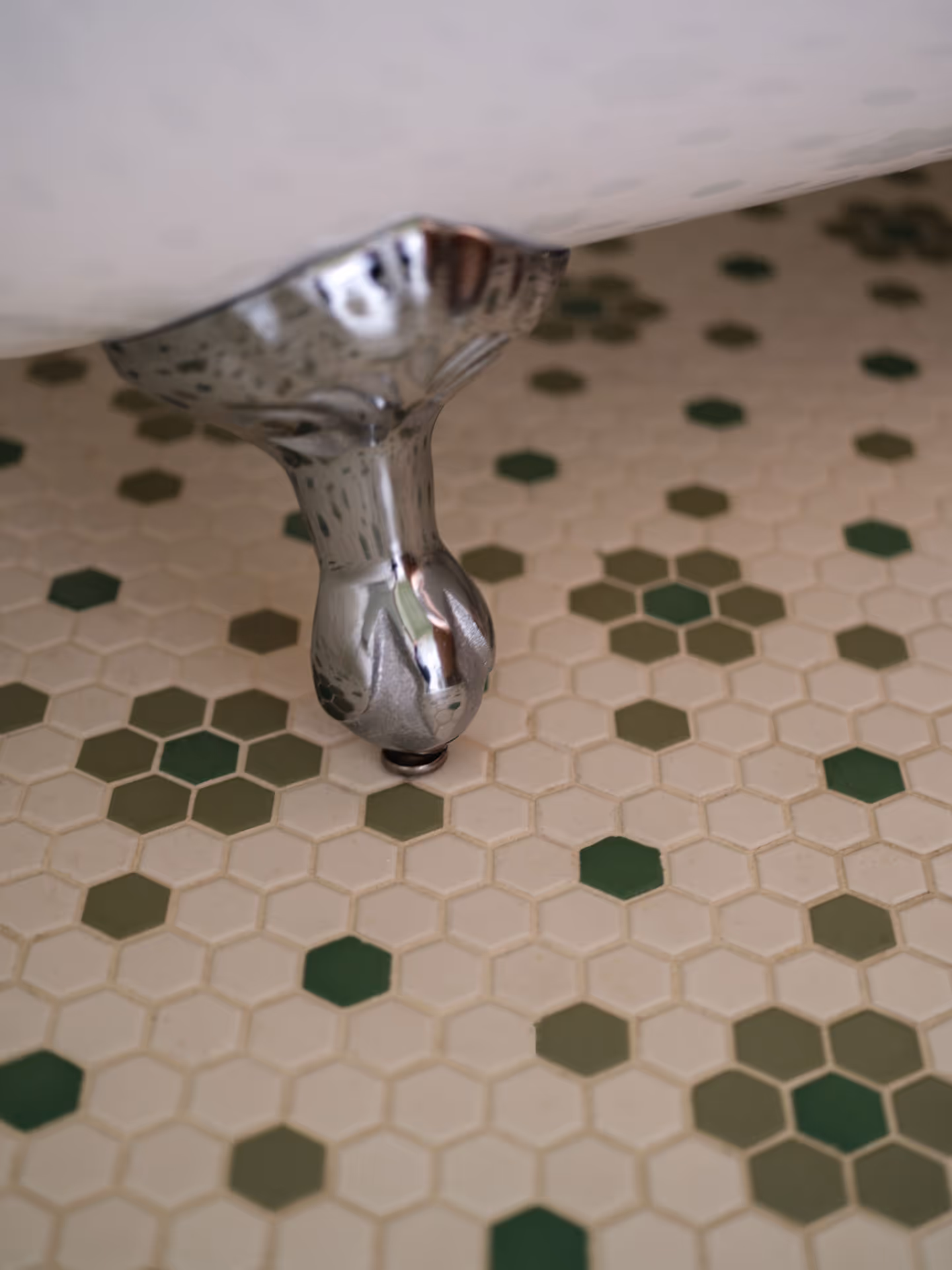 Si les détails d’époque, comme les moulures, la brique exposée et le plancher de lattes, avaient généralement bien été préservés, la salle de bain avait quant à elle subi une modernisation qui détonnait avec l’ensemble des lieux. Pour remédier à la situation, une “remise à vieux” s’imposait. Parmi les matériaux neufs utilisés pour redonner à la pièce son panache d’antan, on retrouve la céramique au mur, le carrelage au plancher, la vanité en cerisier et les petites poignées festonnées. Et bien sûr, la pièce de résistance, élément chouchou du chat de la maison, Champignon, le grand bain sur pattes!