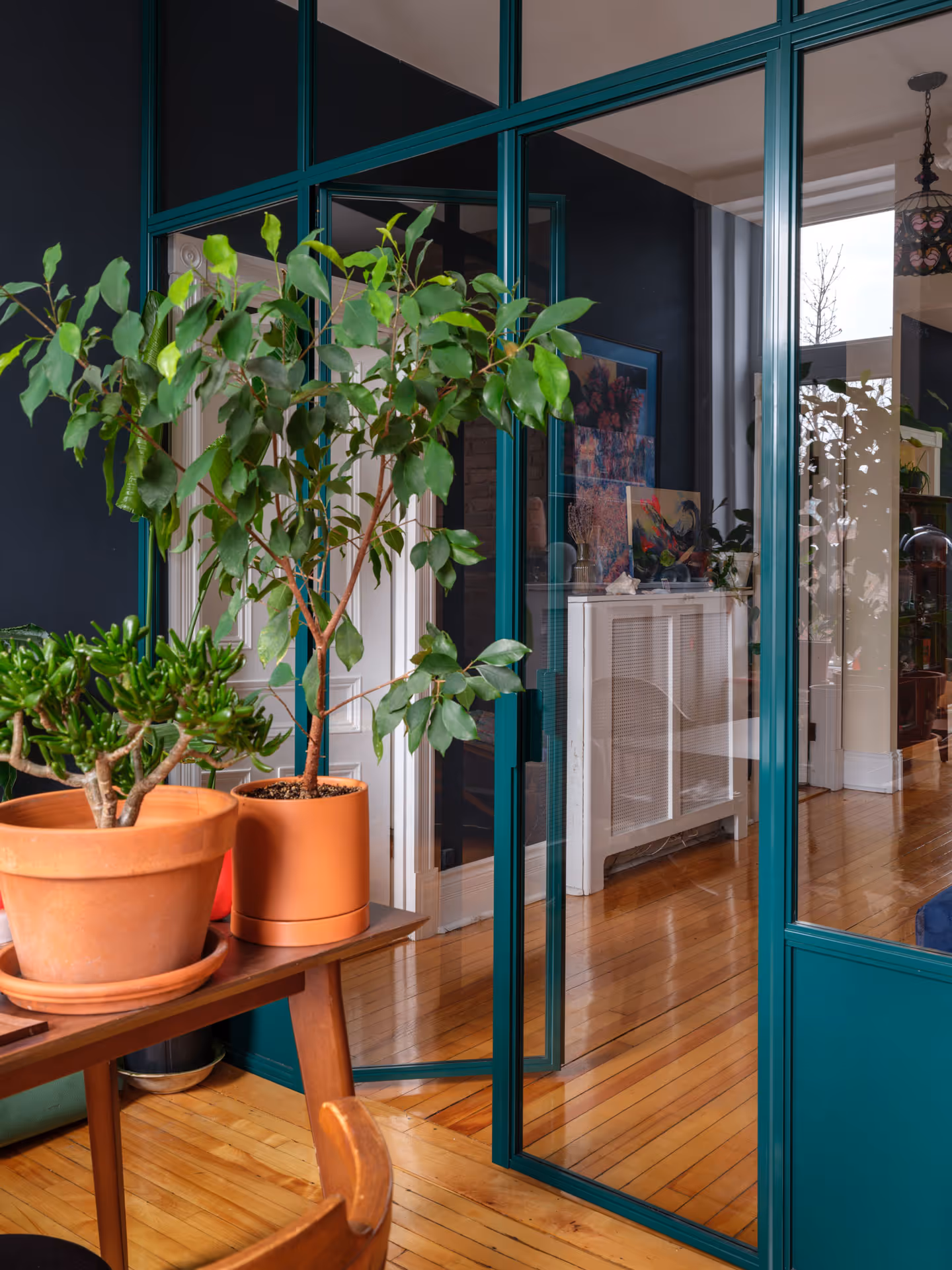 Ailleurs dans l’appartement, on s’inspire des blogues de design britanniques avec la grande unité de rangement encastrée qui épure l’espace avec élégance en assurant un esprit de légèreté à l’aide de détails amusants comme l’échelle de bibliothèque et les poignées en forme de main. Pour rythmer les pièces et préserver l’intimité du bureau, la cloison de verre pleine grandeur au cadre sarcelle offre une solution ingénieuse tout en contribuant à l’aura de romantisme du logis avec son jeu de reflets et de lumière.